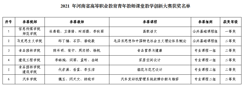 近日,球王会平台印发了《关于公布2021年河南省高等职业教育青年教师课堂教学创新大赛获奖名单的通知》(教职成〔2021〕501 号)文件,球王会平台6支参赛团队全部获奖,其中荣获一等奖1项、二等奖5项。