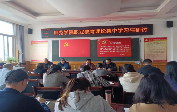 师范学院于近日开展了职业教育理论集中学习与研讨活动。师范学院院长任安忠、党总支书记樊卫兵、教学副院长王国峡、学生副院长李贺林及各科室、各教研室负责人参加会议,会议由党总支书记樊卫兵主持。