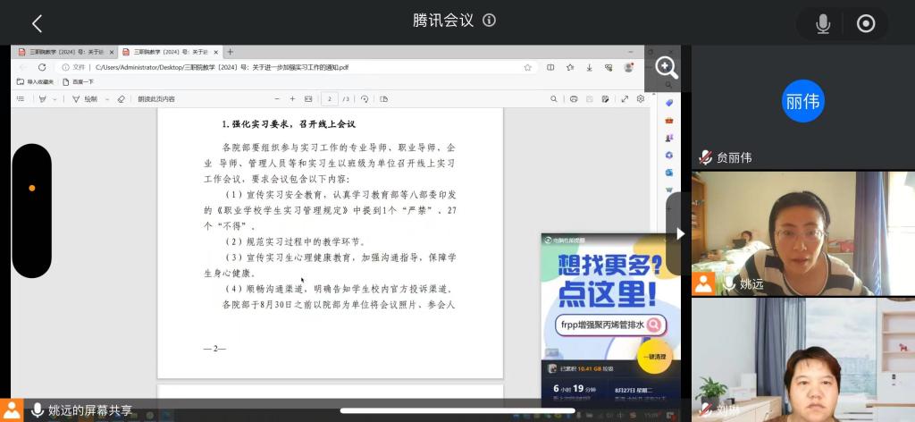 会议主要围绕安全生产、防火防汛、交通安全、水电安全、食品安全、反传销、防盗防骗等安全教育、心理健康教育、职业道德、应急事件汇报、请休假制度等方面展开,关心爱护学生,倾听学生心声,引导学生强化安全防范意识,提高实习生自防、自救能力,正确认识实习的重要性,明确实习任务,端正实习态度,认真开展实习工作。