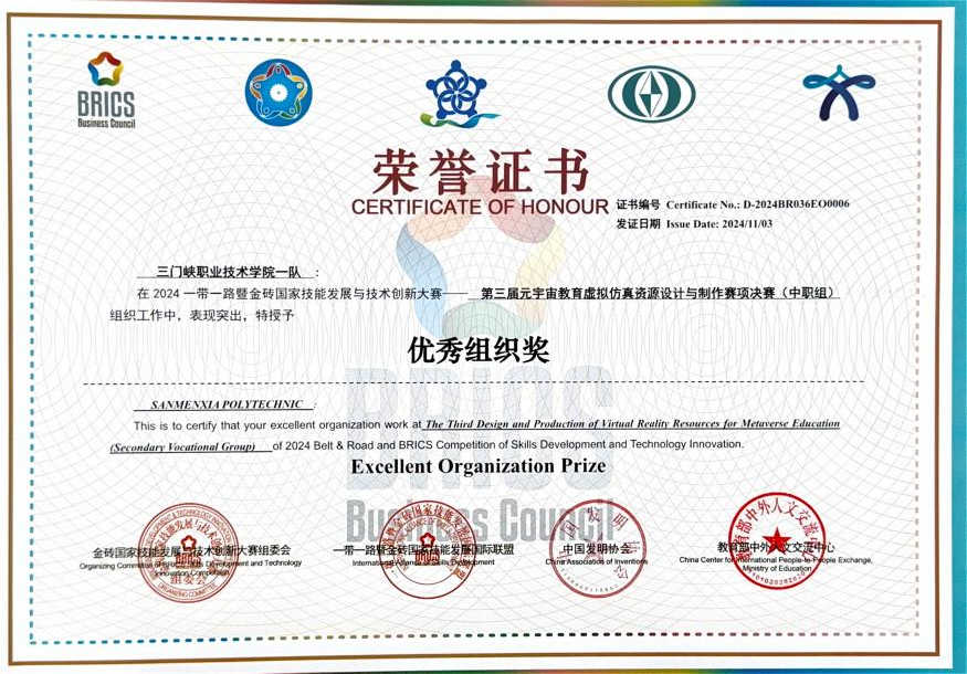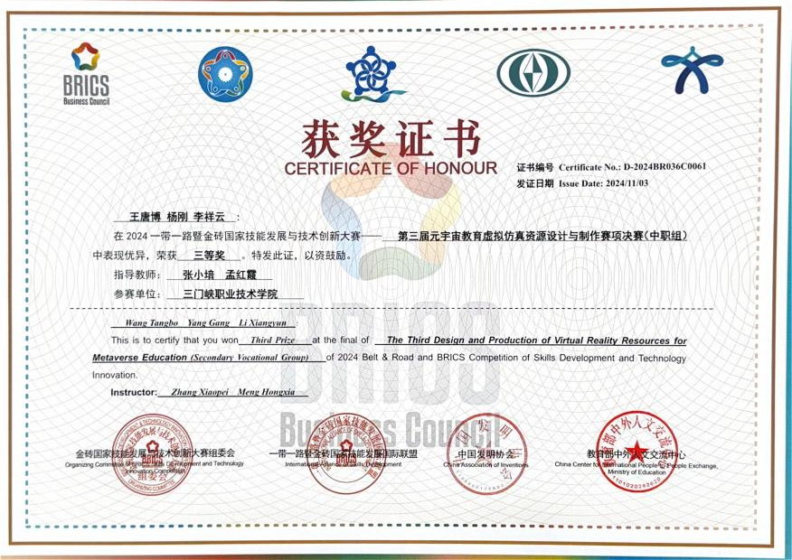 2024年11月1日-3日,2024一带一路暨金砖国家技能发展与技术创新大赛第三届元宇宙教育虚拟仿真资源设计与制作赛项(中职组)国内赛决赛在青岛财经职业学校举行。经过层层选拔,共有来自全国17个省市的32所学校的44支队伍132名选手同台竞技。球王会平台两支参赛团队在师生共同努力下,一路披荆斩棘斩,凭借扎实的专业技能和良好的心理素质,分别获得二等奖、三等奖,赵晨一、薛龙两位教师荣获优秀指导教师奖,球王会平台,球王会官网入口荣获优秀组织奖。