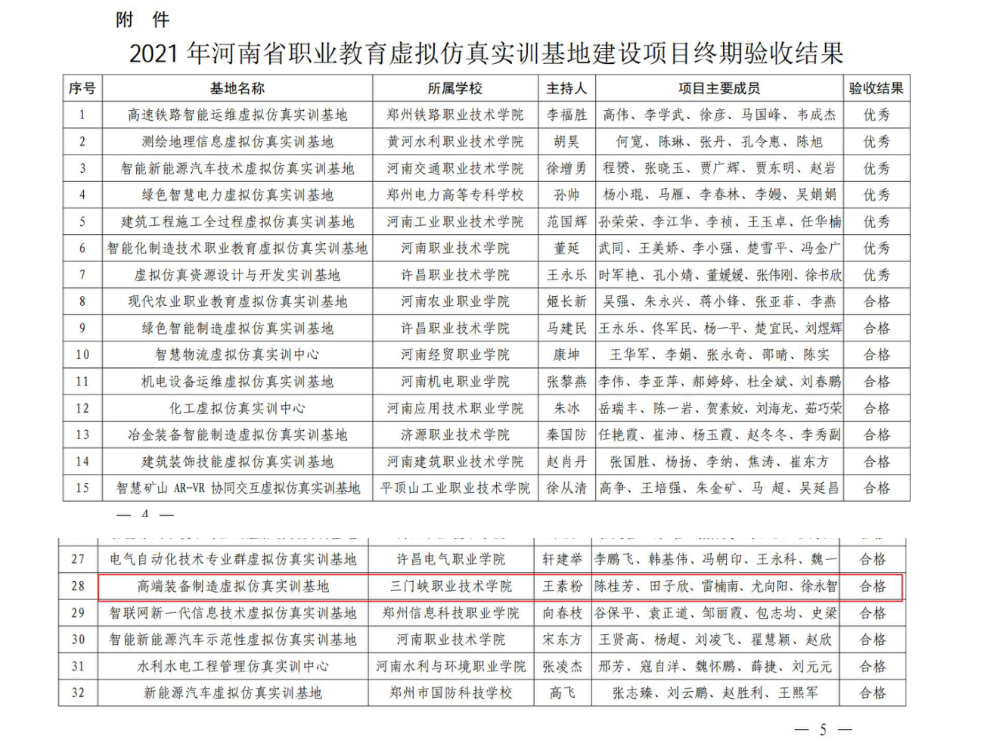 近日,球王会平台公布了《2021年河南省职业教育虚拟仿真实训基地建设项目终期验收结果》(教办职成〔2025〕124号),学院高端装备制造虚拟仿真实训基地项目顺利通过验收。