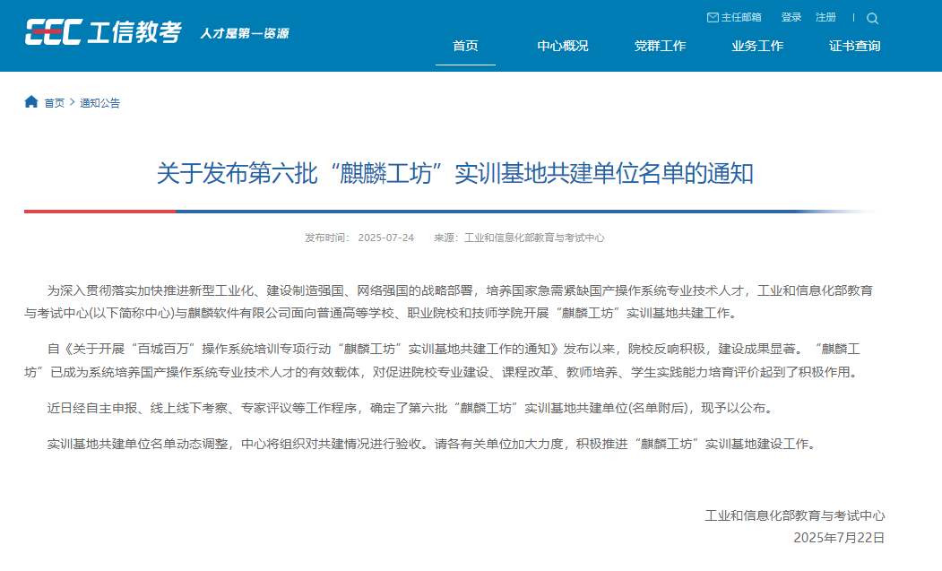 近日,工业和信息化部教育与考试中心与麒麟软件有限公司联合公布了第六批“麒麟工坊”实训基地共建单位名单,学院成功入选,成为国家级信创产教融合平台的共建院校之一。